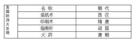 又比如小學(xué)歷史《四大發(fā)明》一課,課文層次清楚,四部分內(nèi)容表達方式相仿,教師可采用表格式板書,邊講邊填寫,既節(jié)約時間,又可提高教學(xué)效果。