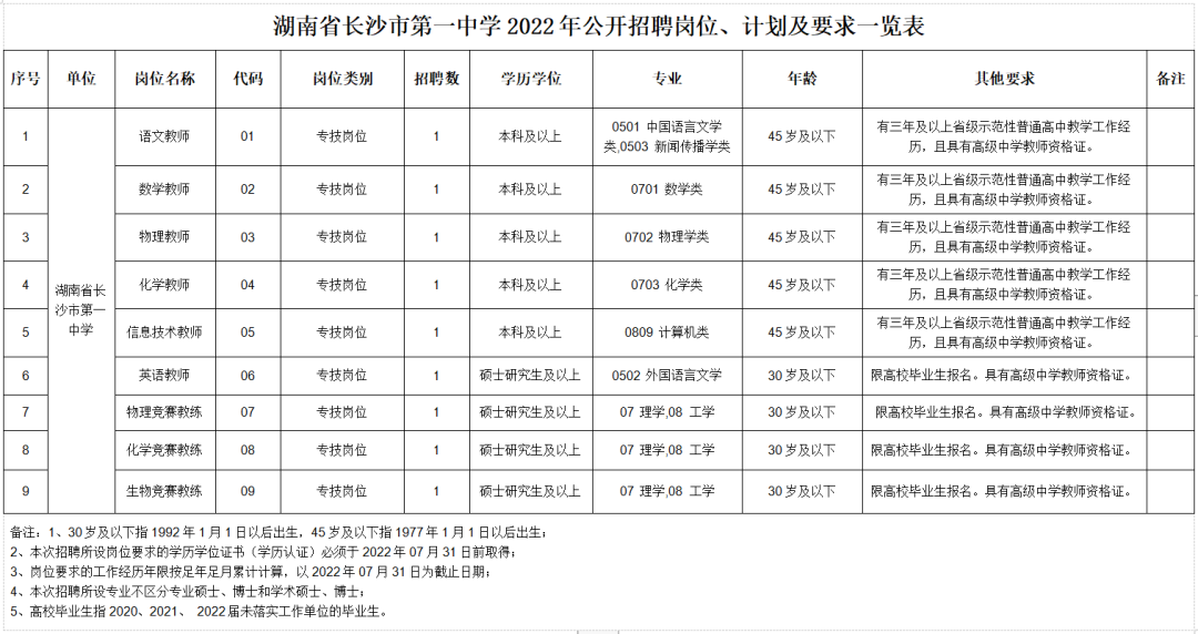 經(jīng)公示無異議的,辦理聘用手續(xù),簽訂聘用合同,實行試用期(包括在聘用合同期內(nèi))。試用期滿,經(jīng)考核合格的,予以正式聘用;不合格的,取消聘用。被聘人員享受本單位同類人員同等待遇。咨詢電話:0731-82561192(長沙市一中人事勞資科)舉報電話:0731-82561197(長沙市一中校紀檢室)掃碼下載文末附件內(nèi)容1.湖南省長沙市第一中學2022年公開招聘崗位、計劃及要求一覽表2.湖南省事業(yè)單位公開招聘人員報名表3.教育部學科專業(yè)目錄匯總
