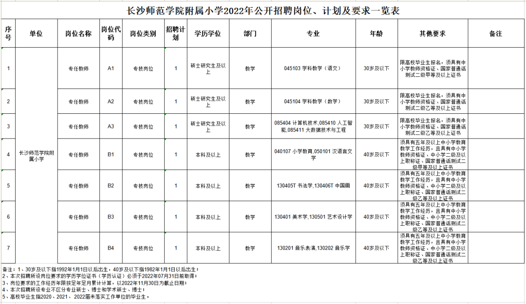 4.相關(guān)要求應(yīng)聘人員的學(xué)歷(學(xué)位)必須為國家承認(rèn)的學(xué)歷(學(xué)位)。出國留學(xué)人員學(xué)歷應(yīng)通過教育部相關(guān)部門的學(xué)歷認(rèn)證。以上學(xué)歷學(xué)位證書(學(xué)歷認(rèn)證)必須于 2022年7月31日前取得。未在規(guī)定期限內(nèi)取得,則取消應(yīng)聘資格。招聘崗位明確要求有工作經(jīng)歷的,應(yīng)聘人員必須提供工作經(jīng)歷證明(加蓋工作單位公章)。在全日制學(xué)校就讀期間參加社會實踐、實習(xí)、兼職等不能視為工作經(jīng)歷。工作經(jīng)歷年限按足年足月累計計算,以 2022年11月30日為截止日期。本次招聘所設(shè)專業(yè)不區(qū)分專業(yè)碩士、博士和學(xué)術(shù)碩士、博士。(三)資格審查根據(jù)崗位招聘條件對應(yīng)聘人員郵箱報名進(jìn)行資格審查,且資格審查貫穿招聘工作全過程。任何環(huán)節(jié)發(fā)現(xiàn)應(yīng)聘人員不符合崗位報名條件或提供的材料弄虛作假,一經(jīng)查實,則取消其考試或聘用資格。通過資格審查人員名單,考試時間、地點(diǎn)將在長沙師范學(xué)院人事處網(wǎng)站、長沙師范學(xué)院附屬小學(xué)網(wǎng)站公布。(四)考試1.開考比例崗位報名人數(shù)與招聘計劃人數(shù)的比例原則上不低于3:1。對少數(shù)專業(yè)特殊確實難以形成競爭的崗位,經(jīng)報請省人力資源和社會保障廳同意后,根據(jù)實際情況可適當(dāng)降低開考比例、核減或取消崗位招聘計劃。2.考試方式采取筆試、試教相結(jié)合的方式進(jìn)行(按百分制折算成綜合成績,其中筆試占綜合成績的30%,試教占綜合成績的70%)。筆試:通過資格審查人員全部參加筆試。筆試采取閉卷的方式,主要測評應(yīng)聘人員的時事政治、教育理論理念和教育實踐及案例分析水平,總分100分。試教:根據(jù)應(yīng)聘同一崗位筆試成績排名先后,按崗位招聘數(shù)1:3的比例確定入圍試教人員。試教采取虛境型片段教學(xué)的方式,主要測評試教人員的專業(yè)素養(yǎng)、教學(xué)技能水平以及對學(xué)科知識的掌握情況等,總分100分。凡經(jīng)批準(zhǔn)降低開考比例,或?qū)嶋H參考人數(shù)未達(dá)到開考比例的,設(shè)置合格分?jǐn)?shù)線60分(含60分)。未達(dá)到合格分?jǐn)?shù)線的,不再進(jìn)入公開招聘下一環(huán)節(jié)。所有崗位均設(shè)置綜合成績合格分?jǐn)?shù)線75分(含75分)。如應(yīng)聘同一崗位所有人員都達(dá)不到合格分?jǐn)?shù)線,則取消該崗位招聘計劃。應(yīng)聘人員參加筆試、面試須攜帶身份證原件和準(zhǔn)考證,各環(huán)節(jié)的考試成績在長沙師范學(xué)院人事處網(wǎng)站、長沙師范學(xué)院附屬小學(xué)網(wǎng)站公布。(五)體檢與考察根據(jù)應(yīng)聘同一崗位綜合成績(綜合成績精確到小數(shù)點(diǎn)后兩位,綜合成績相同的以試教成績?yōu)闇?zhǔn))排名先后,按崗位招聘數(shù)1:1的比例等額確定體檢和考核人員。體檢參照公務(wù)員錄用標(biāo)準(zhǔn)執(zhí)行。體檢合格者進(jìn)入考察環(huán)節(jié)。主要考察應(yīng)聘人員遵紀(jì)守法、思想政治表現(xiàn)、道德品質(zhì)、業(yè)務(wù)能力、工作實績等情況,并對應(yīng)聘人員資格條件進(jìn)行復(fù)查。有體檢或考察不合格者或放棄資格者不予遞補(bǔ)。六、公示根據(jù)綜合成績、體檢和考察結(jié)果,經(jīng)公開招聘工作領(lǐng)導(dǎo)小組集體研究確定擬聘用人員,報長沙師范學(xué)院審查。經(jīng)審查合格的擬聘用人員名單在長沙師范學(xué)院人事處網(wǎng)站、長沙師范學(xué)院附屬小學(xué)網(wǎng)站公示7個工作日。七、聘用及待遇經(jīng)公示無異議的,辦理聘用手續(xù),簽訂聘用合同,實行試用期(包括在聘用合同期內(nèi))。試用期滿,經(jīng)考核合格的,予以正式聘用;不合格的,取消聘用。被聘人員享受本單位同類人員同等待遇。咨詢電話: 0731-84911565(長沙師范學(xué)院附屬小學(xué)辦公室) 舉報電話: 0731-84036995(長沙師范學(xué)院紀(jì)委辦公室) 附件:1.長沙師范學(xué)院附屬小學(xué)2022年公開招聘崗位、計劃及要求一覽表 2.湖南省事業(yè)單位公開招聘人員報名表 3.教育部學(xué)科專業(yè)指導(dǎo)目錄匯總
